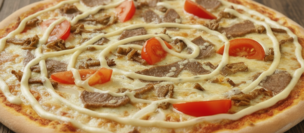 skinka, champinjoner, köttfärs, kebabsås